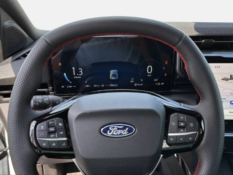 Ford SYNC 4 bietet cloudbasierte Konnektivität, Echtzeit-Verkehrsprognosen, intelligente Sprachsteuerung und kabellose Smartphone-Integration auf einem 12-Zoll-Touchscreen. Die Pro Power Onboard Steckdose liefert 2,3 kW Leistung für Werkzeuge und Geräte, ohne Generator. Mit drei wählbaren Fahrmodi (Normal, Eco, Rutschig) passt sich der E-Transit jeder Aufgabe und jedem Gelände an.